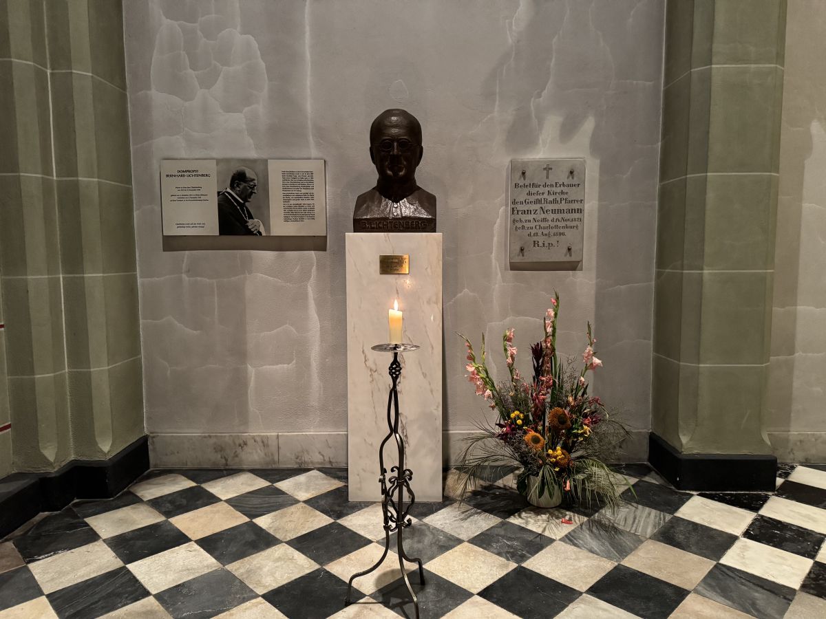 Die Stiftung unterstützt kontinuierlich kirchliche Projekte. Nach dem interessanten Austausch konnten wir die Kirche besichtigen. Eine Bernhard-Lichtenberg-Büste und eine Gedenktafel erinnern an den Widerstandskämpfer hinter dem Rathaus Charlottenburg.